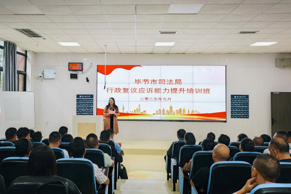 随后,罗培栋代表毕节市司法局对贵州财经大学的支持表示衷心感谢。他深刻阐述了当前毕节市行政复议应诉工作面临的新形势、新任务,分析了队伍建设中存在的短板与不足,强调在学习中要聚焦重点难点,将理论与实践相结合,切实提升解决行政执法问题的能力;罗培栋希望全体学员以此次培训为新起点,不断提升专业能力,为筑牢毕节市法治政府建设贡献力量。