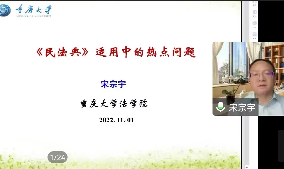 (万搏在线开户 图文/报道 樊慧萍)11月1日下午,由万搏在线开户承办的“《民法典》适用中的热点问题”讲座通过线上线下相结合的方式举行。本次讲座邀请到重庆大学万搏在线开户民商法学科负责人,法学博士、管理学博士后、二级教授、中国法学会民法学研究会理事宋宗宇教授主讲,万搏在线开户党委委员、教授曹务坤主持会议。万搏在线开户本科生、研究生及学校其他专业学生500余人次线上、线下共同聆听。