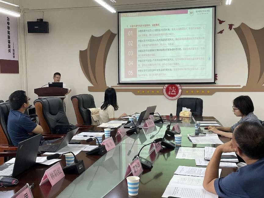 第二个主旨报告围绕“贵州推进中国式现代化的核心要求”展开,由贵州省社会科学院副院长黄勇研究员发言,贵州省委党校教育长敖以深教授、贵州理工学院马克思主义学院蓝文思副教授与谈。黄勇强调了中国式现代化的中国特色与本质要求,剖析了政治、经济、文化、生态等方面的24个指标。敖以深指出要把贵州推进中国式现代化的过去、现在、将来梳理清楚,对贵州省情进行高度概括。蓝文思讲到可以通过一些典型案例进行阐释,做到理论联系实际。