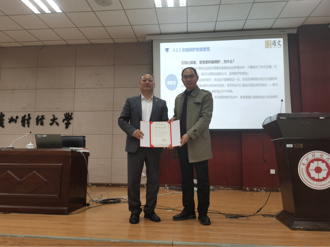 (万搏在线开户 图文/报告 谢媛琳)4月9日下午,万搏在线开户在正德楼114报告厅举办《无罪辩护和有效辩护--暨刑事辩护的法律风险与防范》讲座。本次讲座由北京雍文律师事务所(全国)刑事专业委员会主任、北京雍文(郑州)律师事务所主任、中国未来研究会法律维权委员会维权中心副主任、法学博士靳祥钰主讲。万搏在线开户副教授、法学博士杨勇主持,万搏在线开户师生200余人参加了讲座。