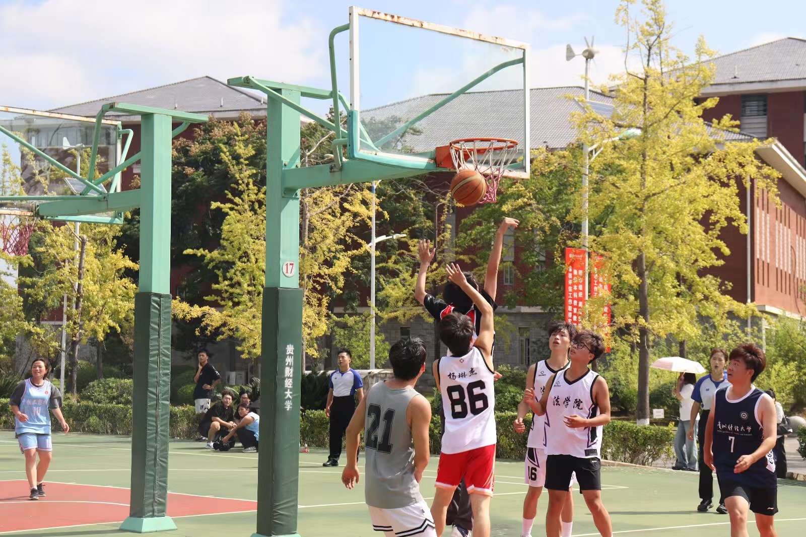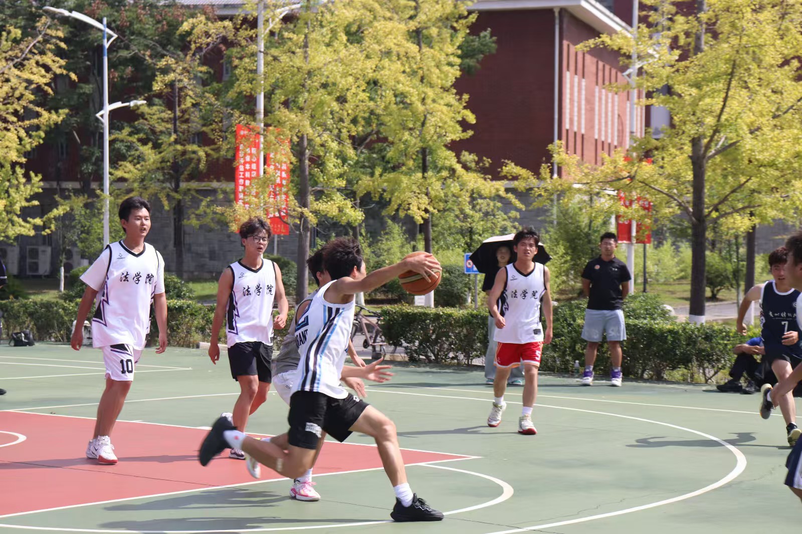 下午赛事热度不减。3:30-4:30,23级法卓班男篮与23级法学班男篮迎来"同门德比"。双方对彼此战术风格极为熟悉,比赛从一开始就进入高强度对抗模式,快攻与防守反击轮番上演,精彩进球不断,最终23级法卓男篮凭借关键球处理优势获胜。紧接着4:40-5:40,24级法学班男篮与24级法实班男篮展开同年级较量,队员们配合默契、拼抢积极,赛场氛围被推向又一个高潮。