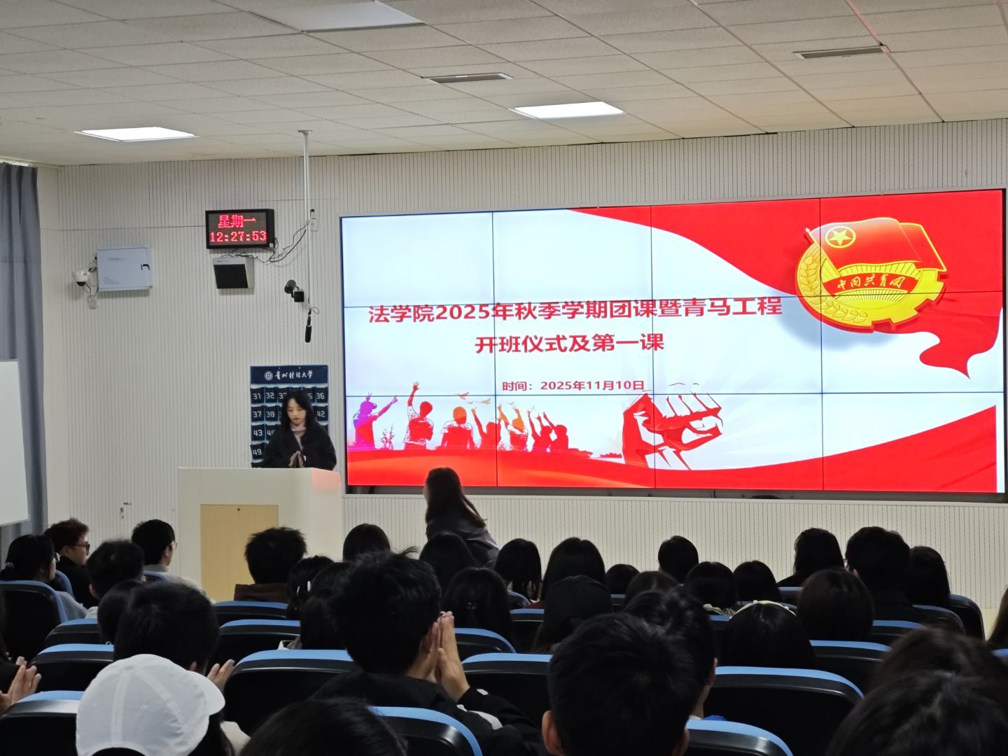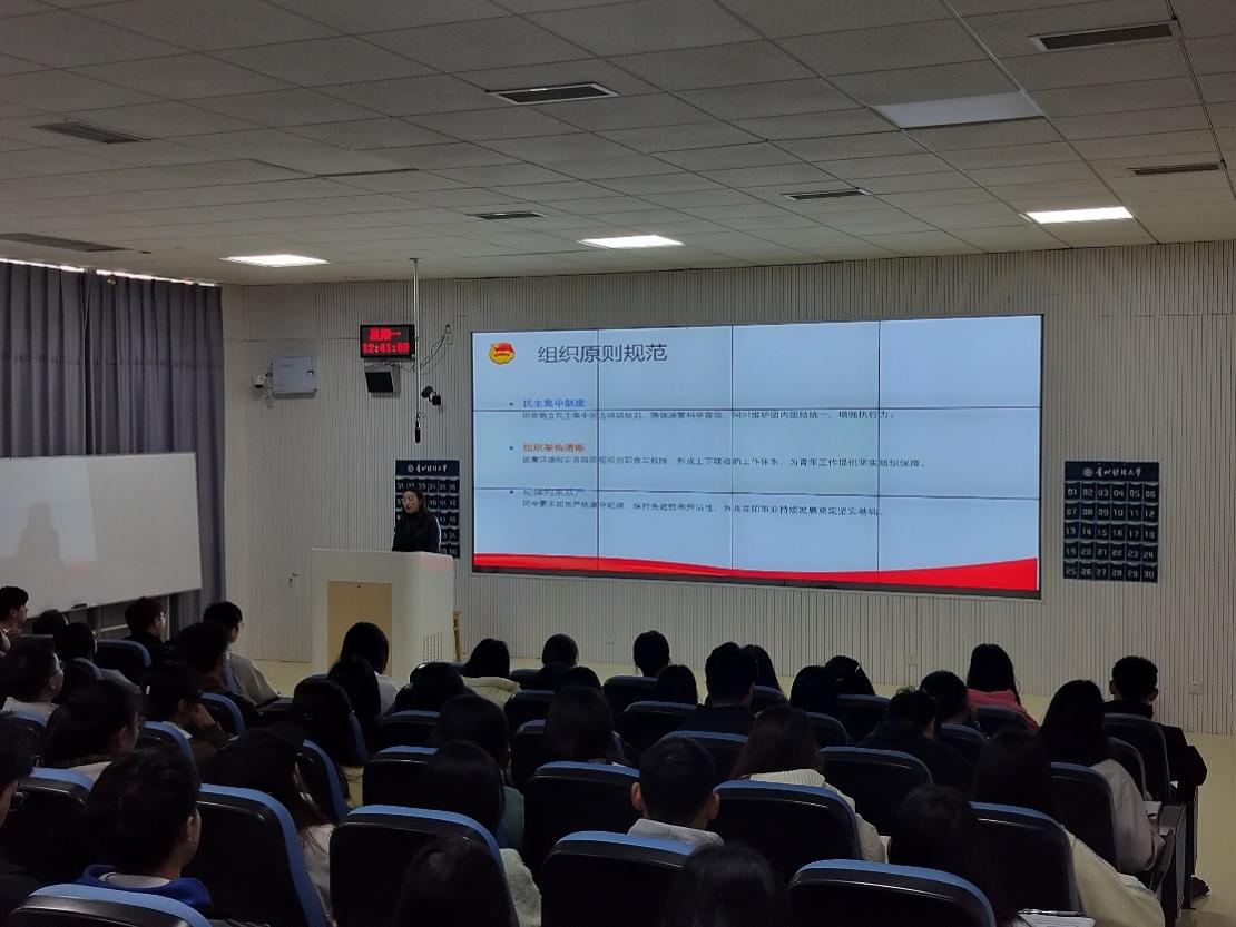随后,彭华以“坚守初心使命,争做时代光辉”为题作开班第一课。她结合共青团的发展历程,深刻阐释了共青团作为党的助手和后备军的光荣使命;并详细解读了团旗、团徽、团歌的深刻内涵与使用规范,强调这些组织象征所承载的政治意义和历史传承;在团员发展方面,她系统讲解了入团的基本条件、发展程序和考核标准,特别对“六团活动”,即(团员教育、管理、团员监督、团员服务、团员发展、团员表彰)的内涵要求进行了深入阐述。