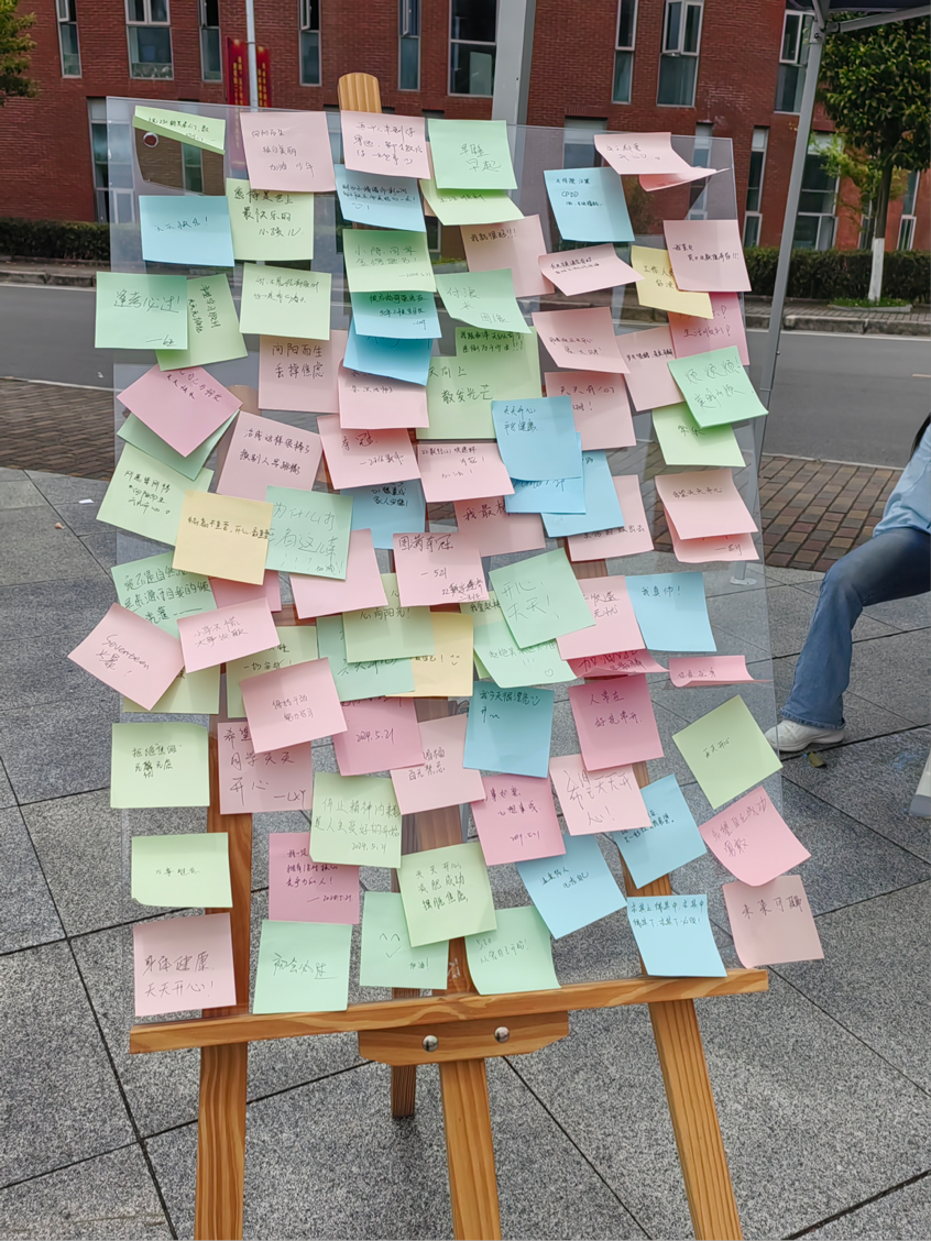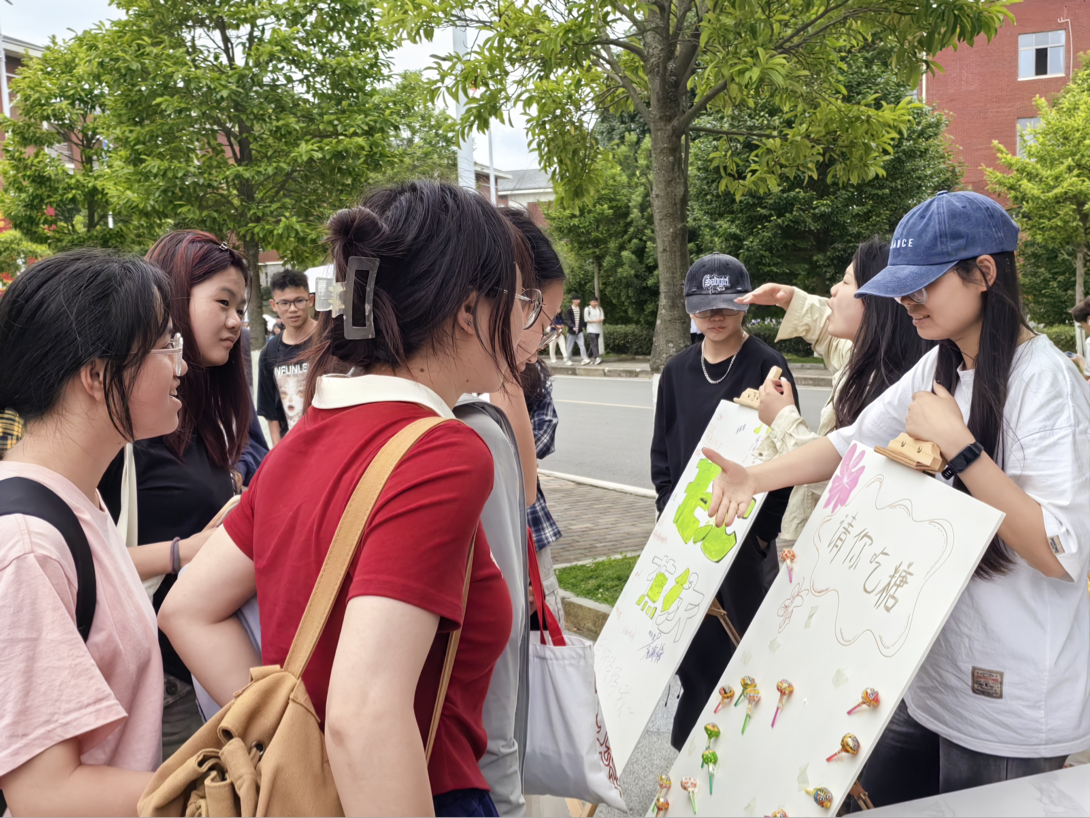 活动伊始,万搏在线开户在五四广场设置摊位摆点,由学院各班心理委员在点位上组织开展心理健康娱乐活动。各心理委员引导现场学生通过石头剪刀布等小游戏进行对决,营造热烈氛围,获胜学生即可获得精美糖果。学院也在点位布置了“心愿板”与“涂鸦墙”,现场同学或将写有愿望的便签纸挂在树上,许下美好的心愿;或在“涂鸦墙”上抒发自己的小想法,表达对生活、学习的期许。