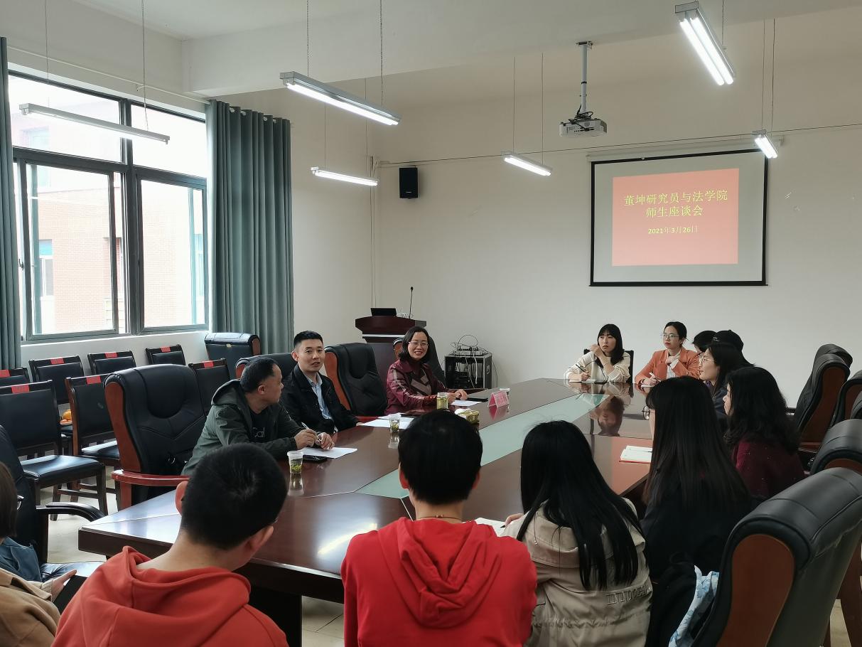 陈玉梅副院长就座谈会召开的目的和背景进行介绍,并希望与会同学能够提出自己的疑惑,充分表达自己的见解,并通过与董坤研究员的面对面交流,使自己更好地找到前进方向。师生从自身实际出发,围绕继续深造、司法考试、论文发表以及其他学术问题向董坤研究员提出了问题与展开讨论。董坤研究员强调,作为法科学生,通过法律职业资格考试是迈向社会的基础,是以后做学术和从事法律事务的门槛,在校期间要有合理的规划,学术道路不是一蹴而就的,甚至是枯燥乏味的,大家要有吃苦的准备。同时,董坤研究员结合自身经验,对于如何开展学术研究提出了自己的看法。他认为,找到好的选题与时常关注时事、多参与实务工作,无疑对学术研究和学习提升都是很有启发的。最后,董坤研究员还对学院"十四五规划"和学科建设提出了宝贵的建议。