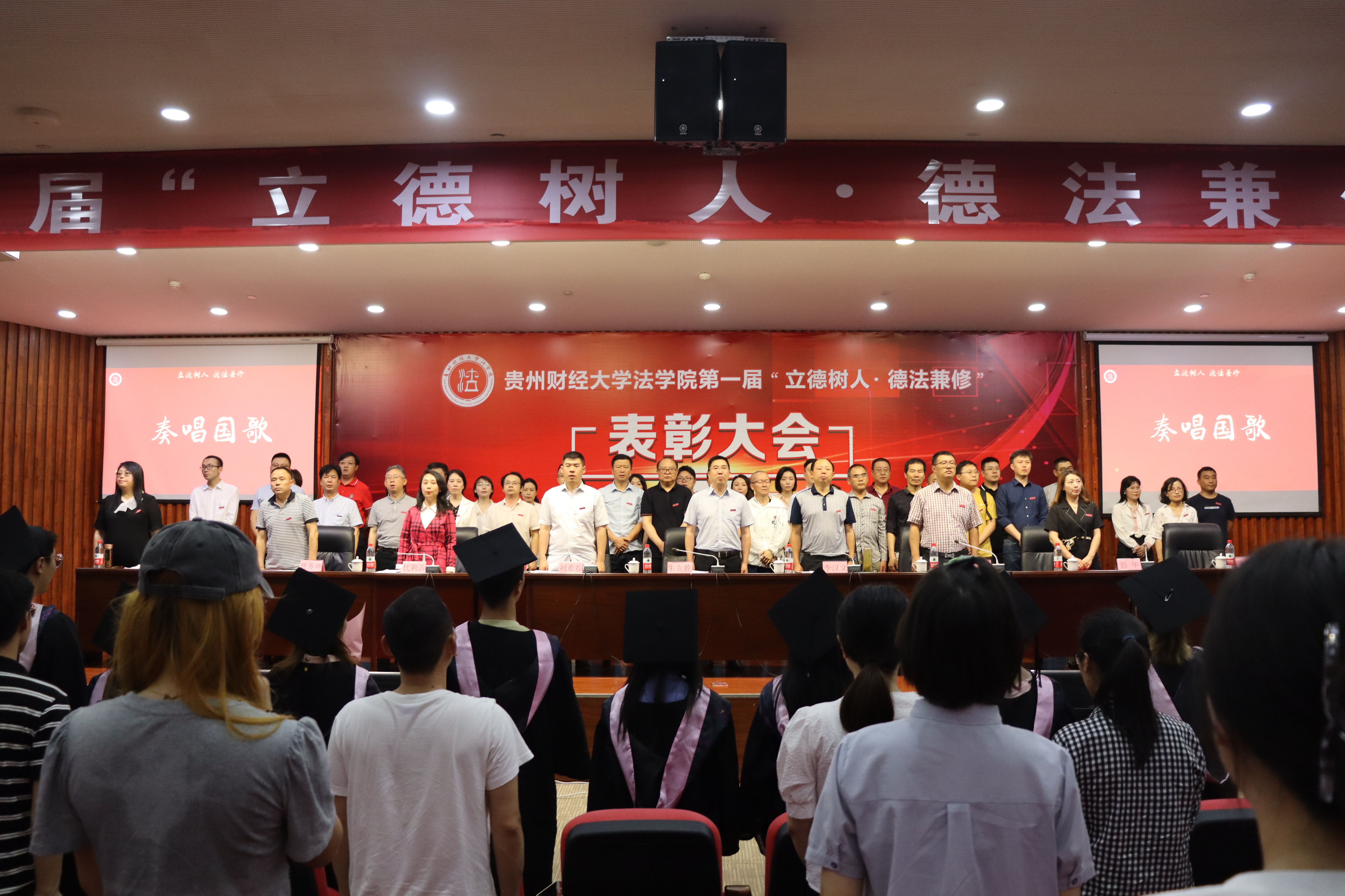 在会议议程的第一篇《立德树人 德法兼修》中,全体参会人员唱国歌,观看了《法治的力量》纪录片。