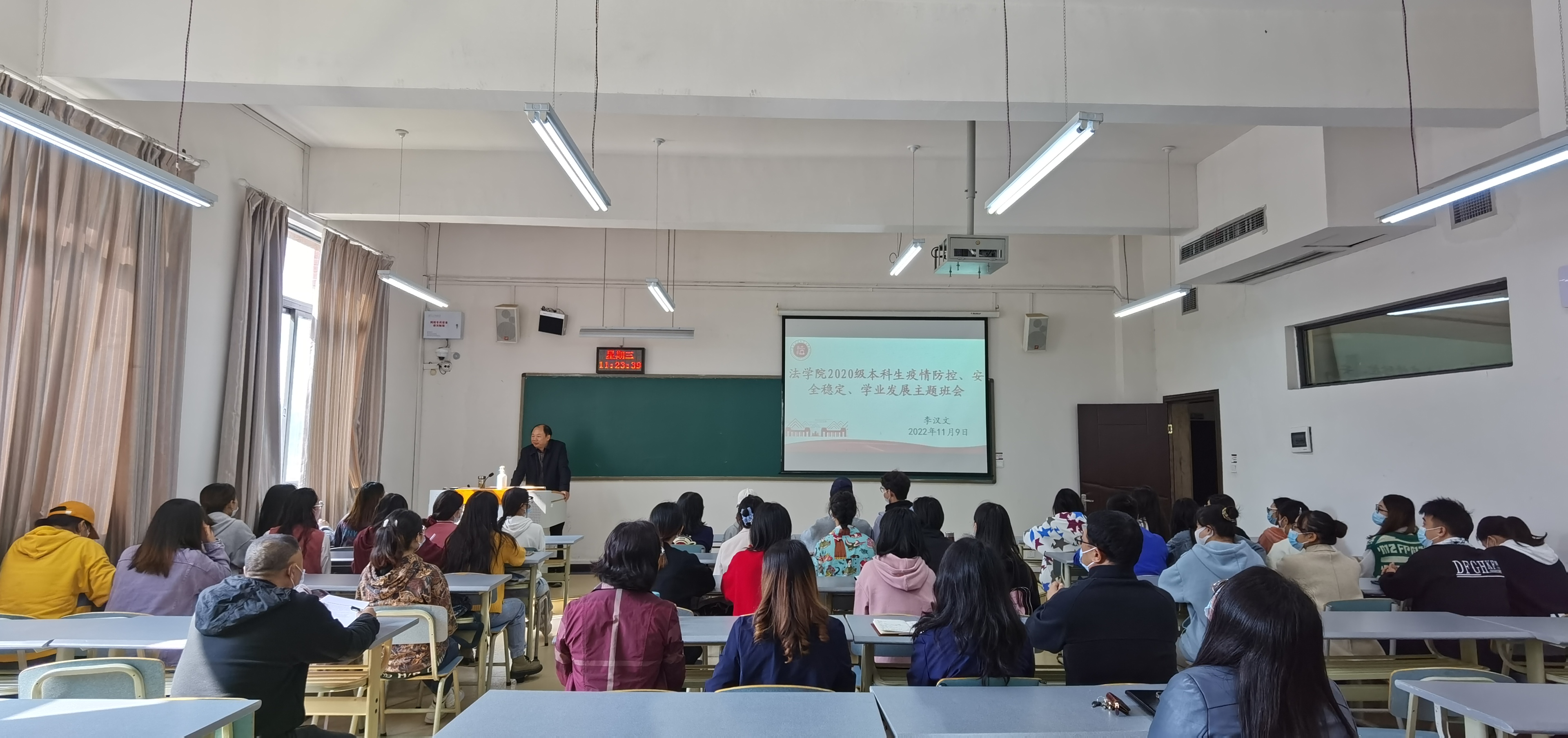 (万搏在线开户 米钰 报道/图片 杨珊)2022年11月9日中午,校党委委员、副校长李汉文到文德楼202教室与联系的万搏在线开户2020级法学(卓越人才计划)班本科生召开了主题班会,万搏在线开户党委书记詹伟,党委副书记、院长陈玉梅以及其他班子成员、辅导员参加班会。