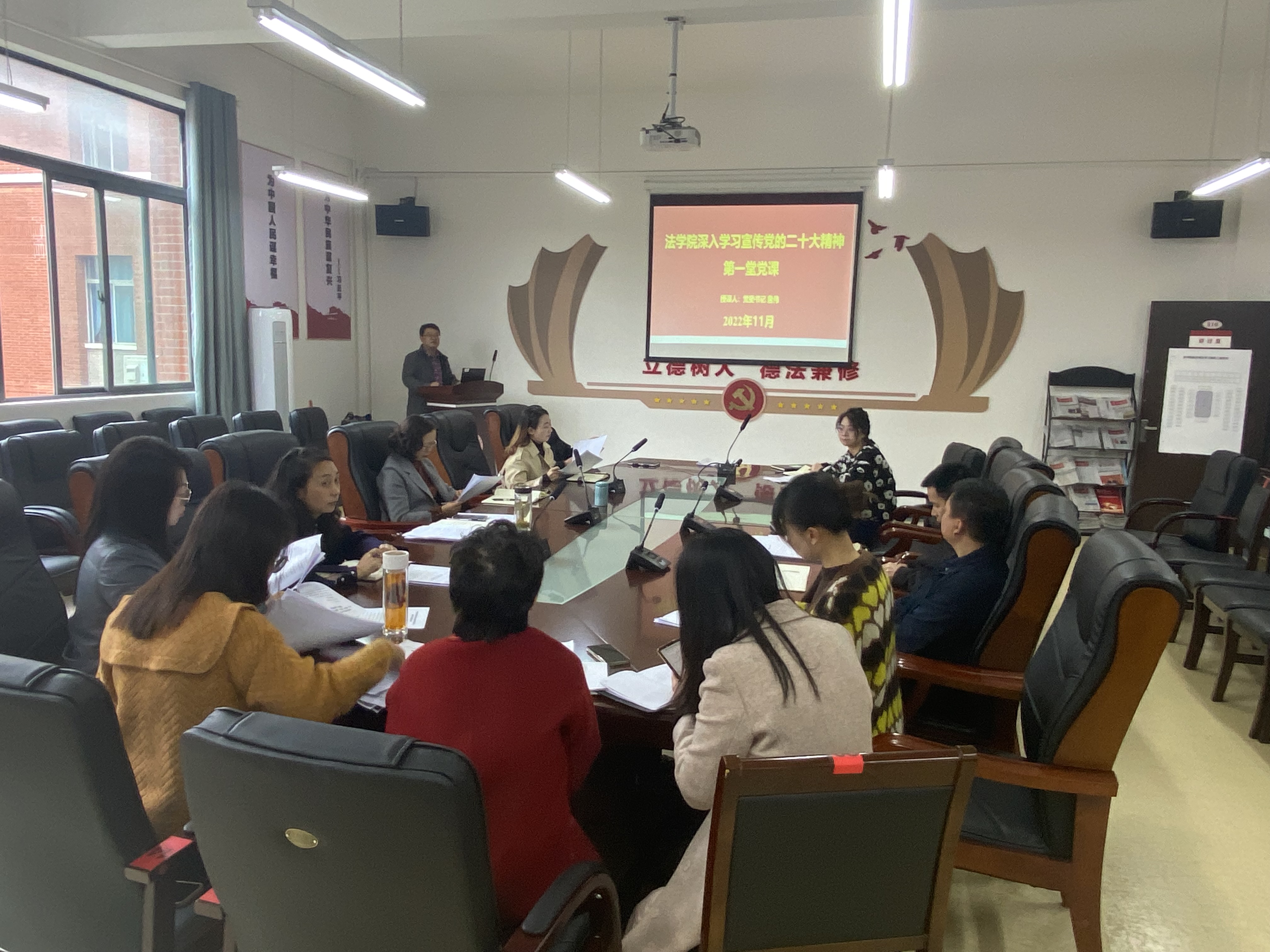 詹伟为全体参会人员作了《党的二十大报告精神及<党章>有关知识点解读》的首堂党课。詹伟以关键词的形式,紧紧围绕习近平新时代中国特色社会主义思想这个主线,全面介绍了党的二十大召开的重大意义,精辟分析了报告的整体框架,深刻准确地阐释了报告的核心要义和精神实质。詹伟也以关键词的形式对党章的修改部分做了讲解,他指出党章的修改部分充分体现马克思主义中国化时代化最新成果,充分体现党的十九大以来党中央提出的治国理政新理念新思想新战略。党章修改部分体现了全党意志,符合时代要求,顺应党心民意。他要求学院全体党员要把学习党的二十大精神与学习新党章有机结合起来,保持与时俱进的精神状态,不折不扣地推动党的二十大精神和新党章在本职工作岗位上落地生根,开花结果。