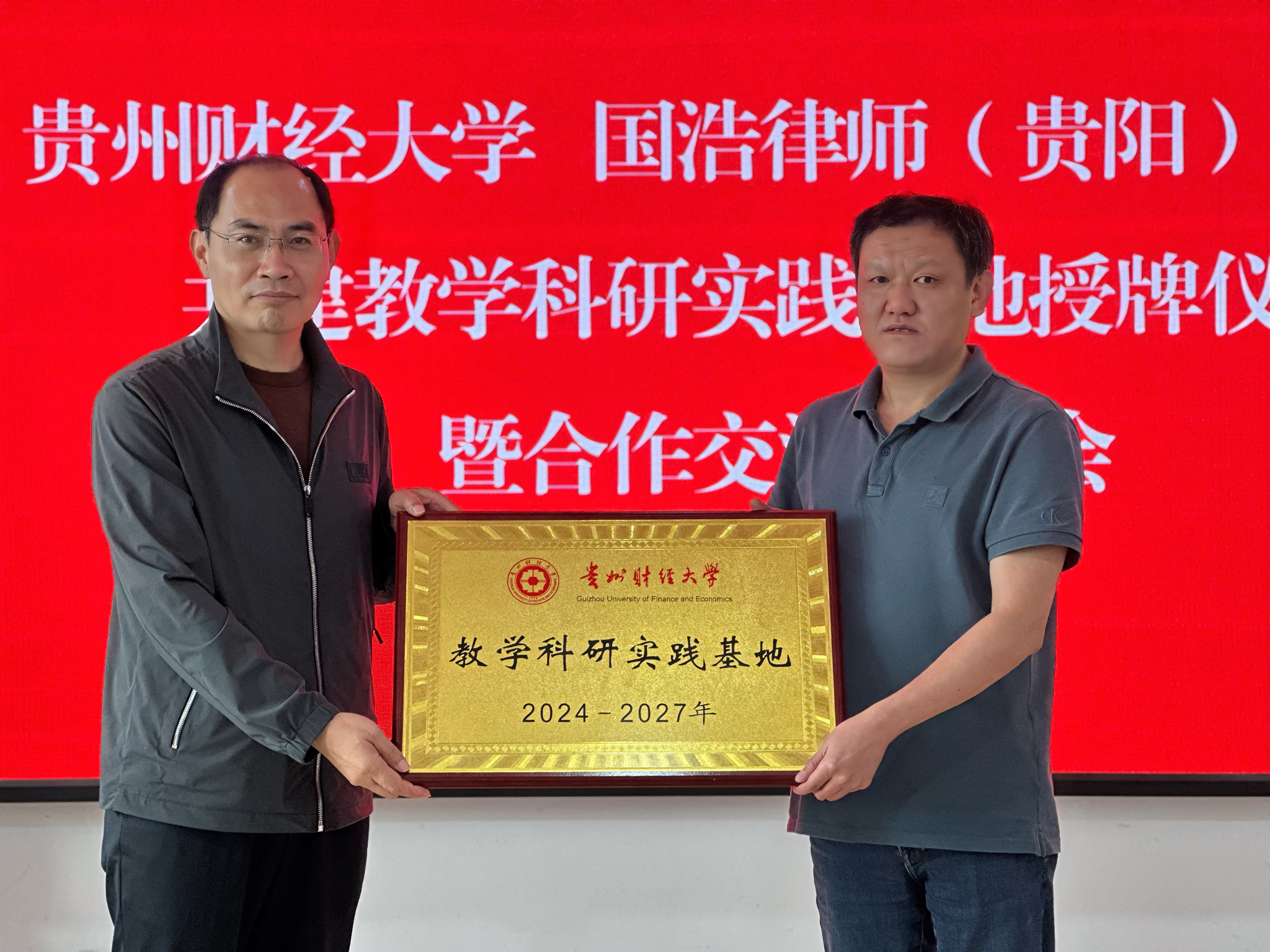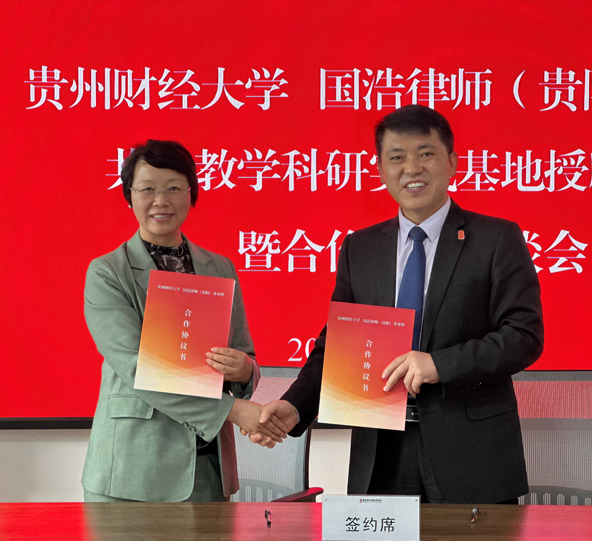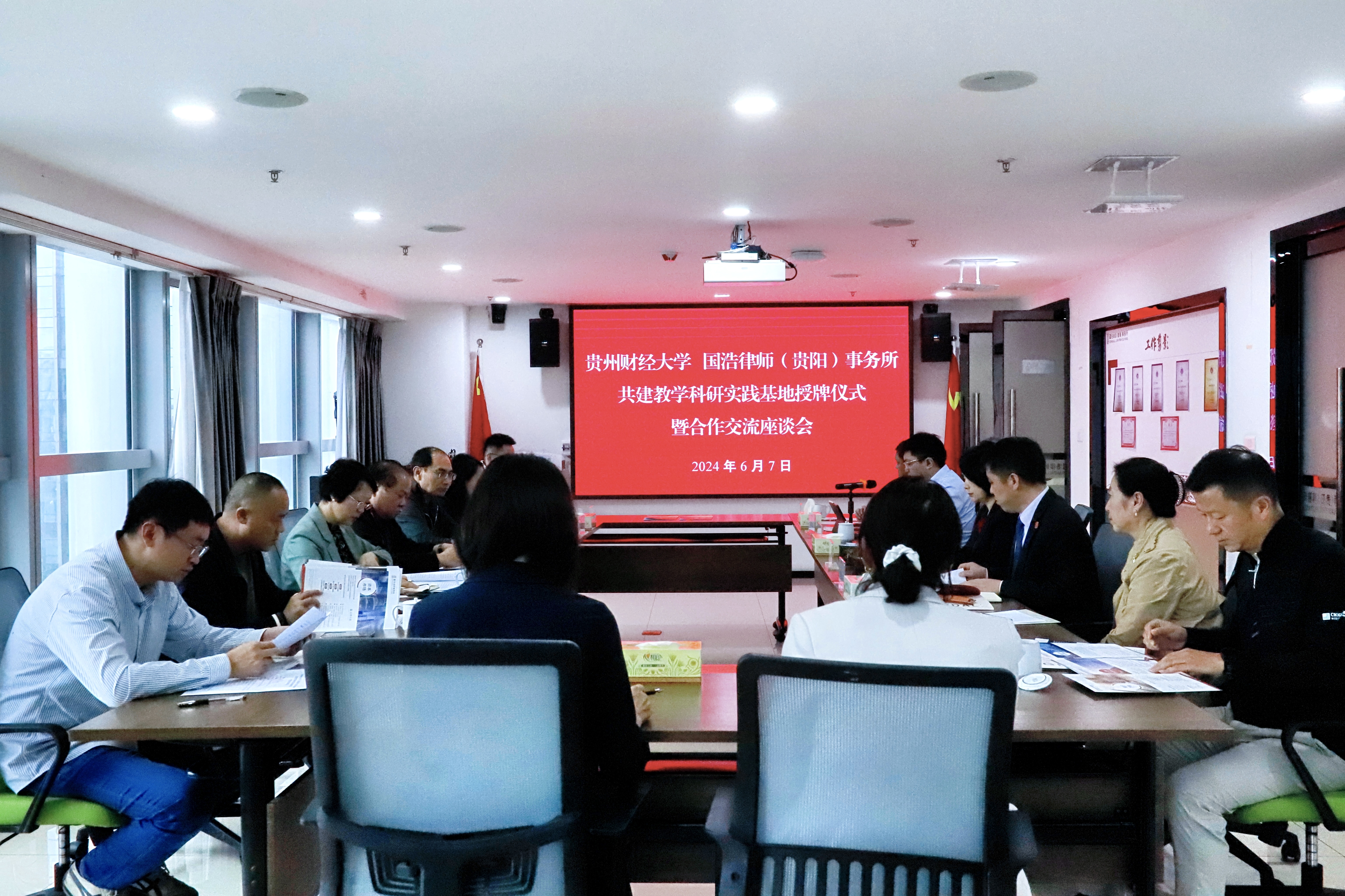 (万搏在线开户 王霖 图文/报道)2024年6月8日下午,贵州财经大学特聘教授、贵州省社会科学院原党委书记吴大华;万搏在线开户党委书记邵新顺,党委副书记、院长陈玉梅一行前往国浩律师(贵阳)事务所(以下简称为“国浩贵阳律所”),举行共建教学科研实践基地授牌仪式暨合作交流座谈会。贵州省律师协会会长、国浩贵阳律所合伙人白敏;国浩贵阳律所主任、管理合伙人郑世红,党支部书记、管理合伙人兰钢等人员出席会议。会议由国浩贵阳律所管理合伙人潘志成主持。双方就党建工作开展、法商融合型人才培养、科研合作创新、实践成果转换等问题进行了深入交流。
