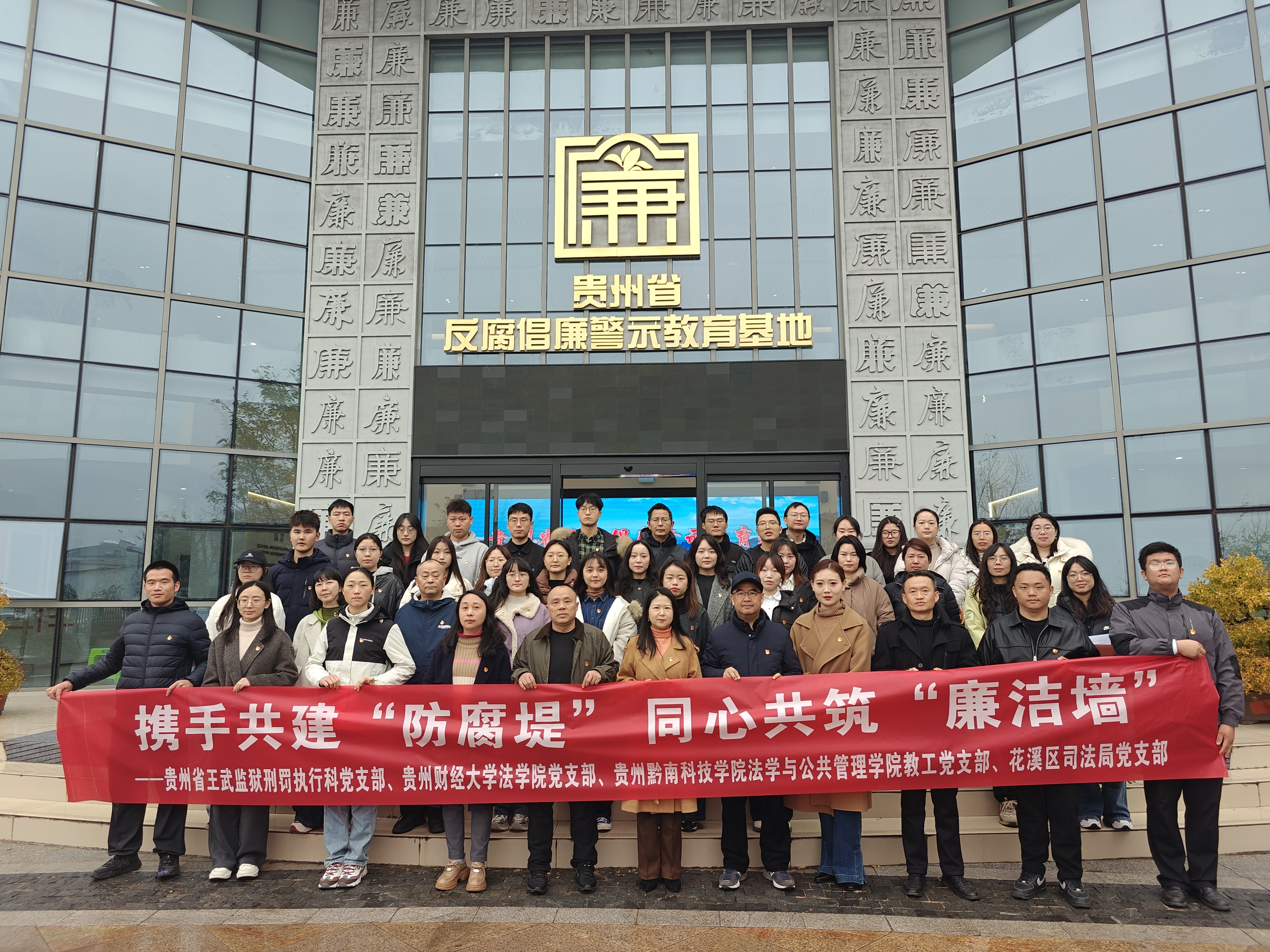(刘杰 摄影)为深入学习贯彻党的二十届四中全会精神、习近平法治思想和省委十三届八次全会精神,深化校监地党建与业务融合发展,在第八个“宪法宣传周”来临之际,12月2日,万搏在线开户教工第一、第二党支部联合花溪区司法局党支部、贵州黔南科技学院法学与公共管理学院教工党支部、贵州省王武监狱刑法执行科党支部,共同开展“校监地联动促发展 警教结合育清风”主题党日活动。