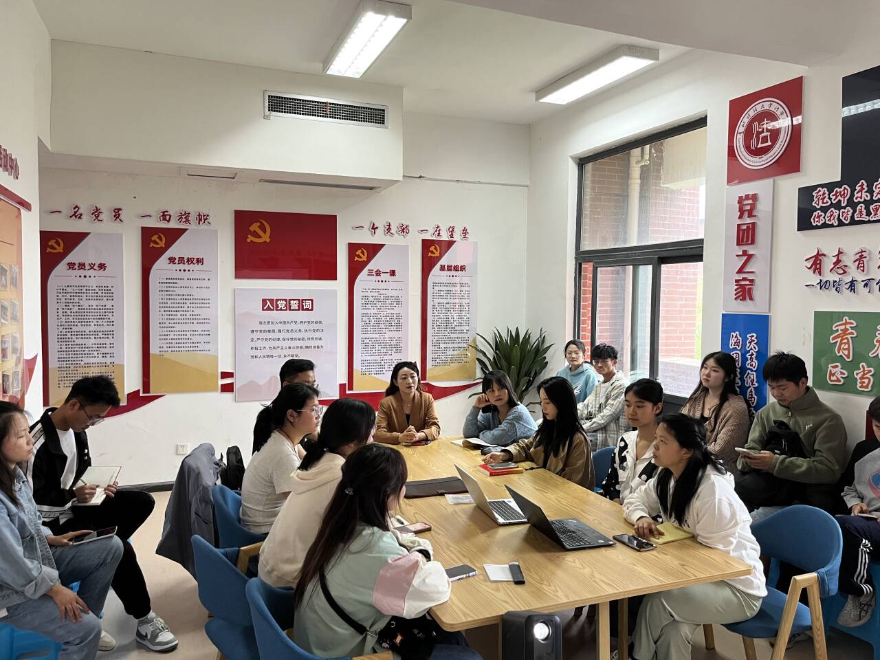 活动中,杨兴莉老师为同学们详细介绍了入党的流程;刘美伶老师给大家分享了评奖评优中关于综合测评加分的相关要求;郭雪老师与在场学生组织负责人就“党团之家”活动室近期开展的相关工作进行了研判;任鹏举老师与同学们分享了考研、英语四六级考试、国家公务 员考试等经验。