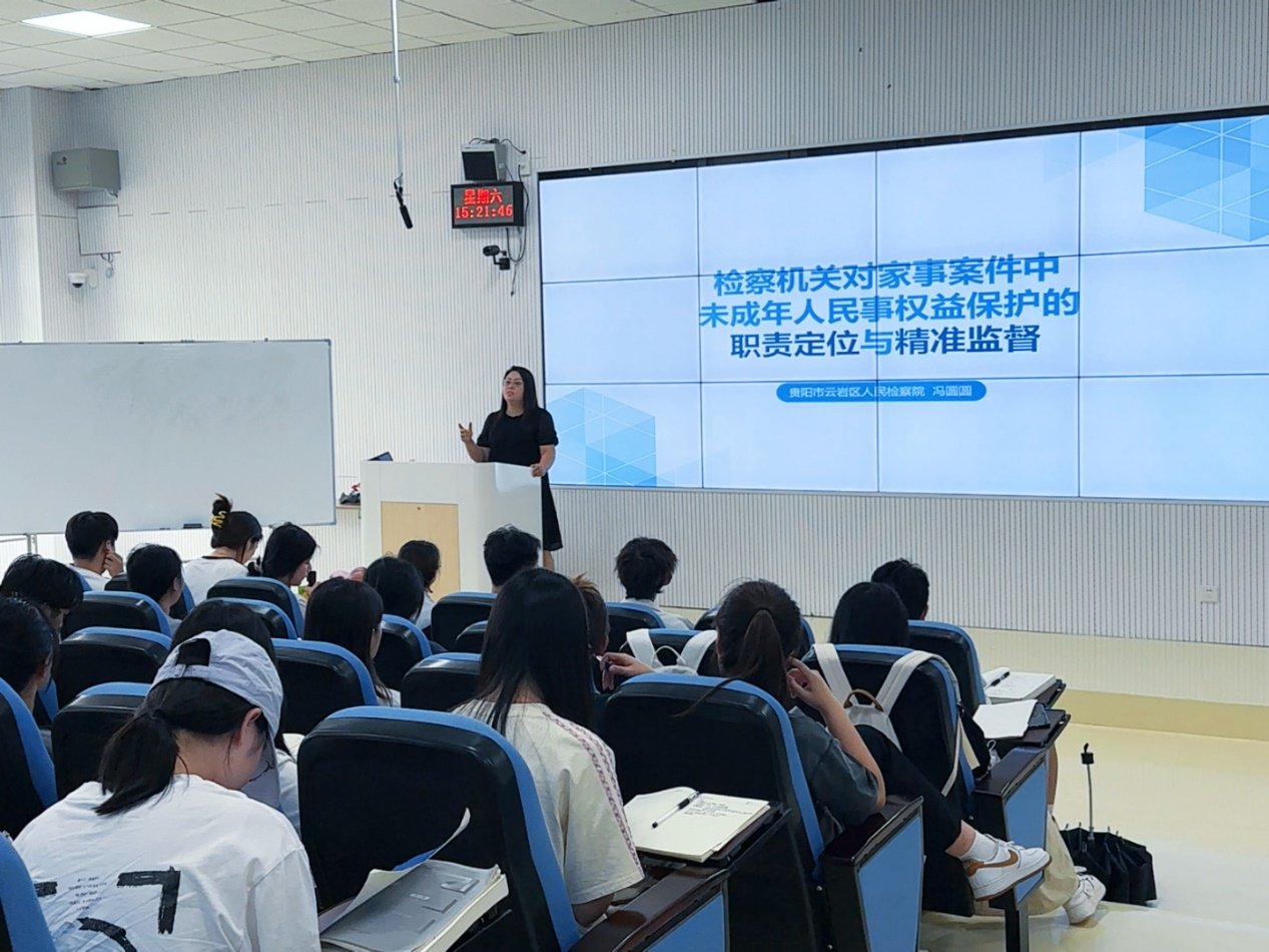 (万搏在线开户 王紫微 刘媛 图文报道)9月9日下午,我校“三大论坛”之人文论坛、贵州省人民检察院“检察实务专家进校园”系列课程第二讲在乐学楼成功举办。本次讲座特邀贵阳市云岩区人民检察院检委会专职委员、一级检察官冯圆圆,以“检察机关对家事案件中未成年人民事权益保护的职责定位与精准监督”为主题进行授课,万搏在线开户副院长宋昭澜主持讲座,百余名师生到场聆听、交流。