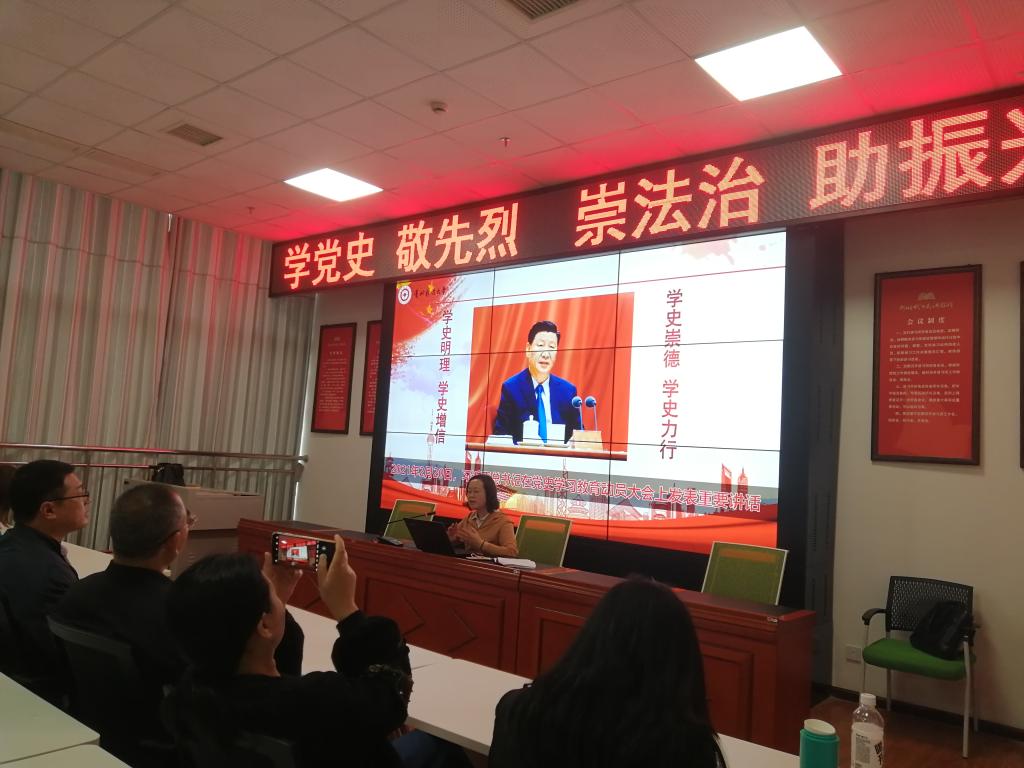 陈玉梅从新民主主义革命、社会主义革命、社会主义现代化建设以及中国特色社会主义新时代四个历史时期带领全体教职工回顾了百年党史,从五个方面的发展成就总结了党在百年奋斗中做出的伟大贡献,然后将“九个始终坚持”与具体事例相结合讲述了党在革命、建设、改革中的宝贵经验。陈玉梅还讲述了万搏在线开户法学学科建设过程的不易,尤其是法学一级硕士学位授权点的获得是法学几代人奋斗的结果。