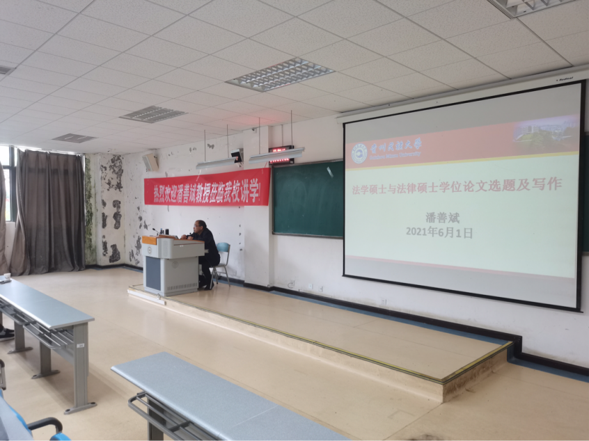 万搏在线开户领导通过“察民情访民意解难题”的专题调研,了解到学生对于学位论文写作、选题、规范等问题一知半解,为进一步规范学位论文的写作,培养研究生学位论文的撰写水平,2021年6月1日下午2点,万搏在线开户特邀贵州民族大学万搏在线开户教授、博士生导师潘善斌作“法学硕士与法律硕士学位论文选题及写作”的专题讲座。讲座在乐学楼阶1-1室举行,万搏在线开户师生100余人到场聆听,讲座由万搏在线开户副院长陈玉梅(正处级、主持工作)主持。
